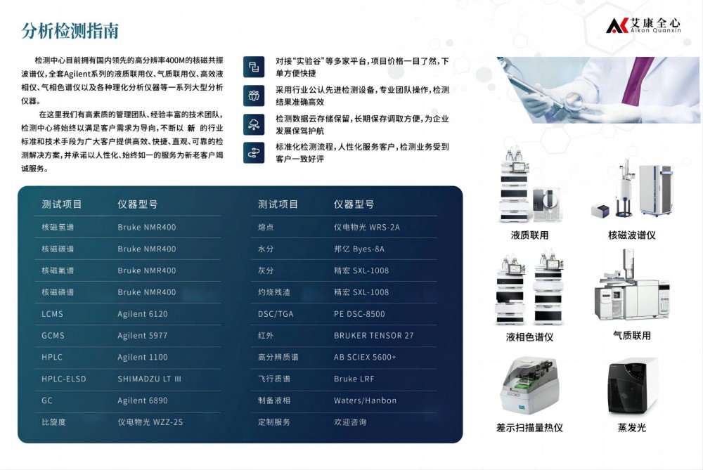 艾康全心分析检测中心目前拥有国内先进的高分辨率400M的核磁共振波谱仪,全套Agilent系列的液质联用仪、气质联用仪、高效液相仪、气相色谱仪以及各种理化分析仪器等一系列大型分析仪器。
